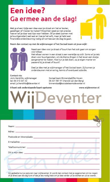 Deventer- Heeft u een leuk idee of een initiatief om de leefbaarheid, sociale contacten of onderlinge hulp in de buurt of het dorp te verbeteren? WijDeventer nodigt u uit om uw idee in te dienen.