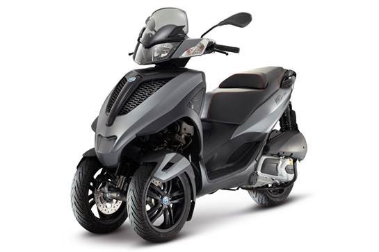 Het gaat om een matzwarte Piaggio MP3 500LT Sport motorscooter.